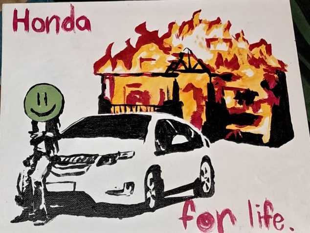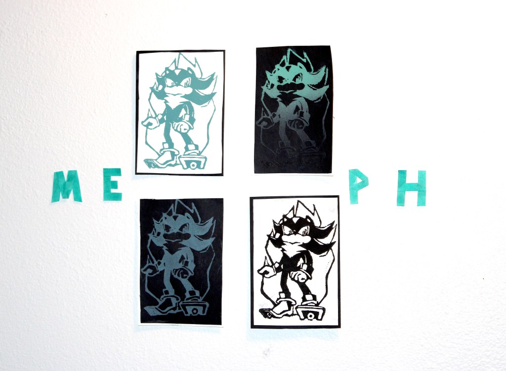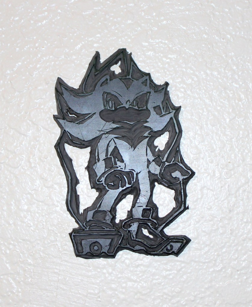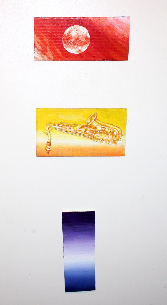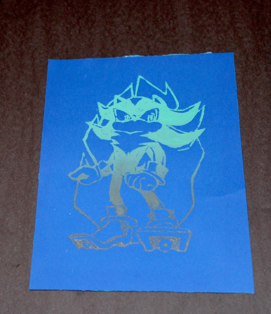 - Medium/Type: painting with acrylic paint, fuzzy paper, stencil, and gold thread