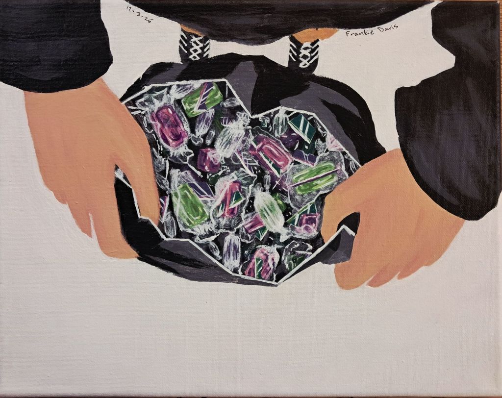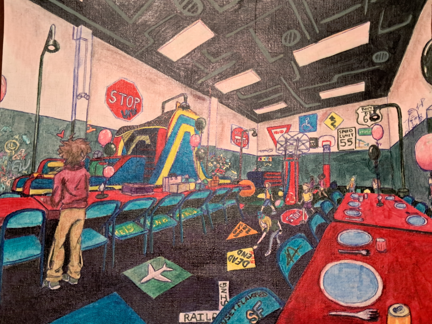I was inspired by Rylie’s 9th b-day party that took place in an indoor gym. I took on a much more parental role, and I didn’t even realize it until my teacher pointed it out to me while I was brainstorming. So, this piece represents the aspects of my siblinghood that are “parental.” It looks like any normal b-day party until you notice the signs and street lamps. These demonstrate my guidance and support in their lives. There’s graffiti littered around the room because I value individuality and voicing your opinion, and what gets more opinionated than graffiti?