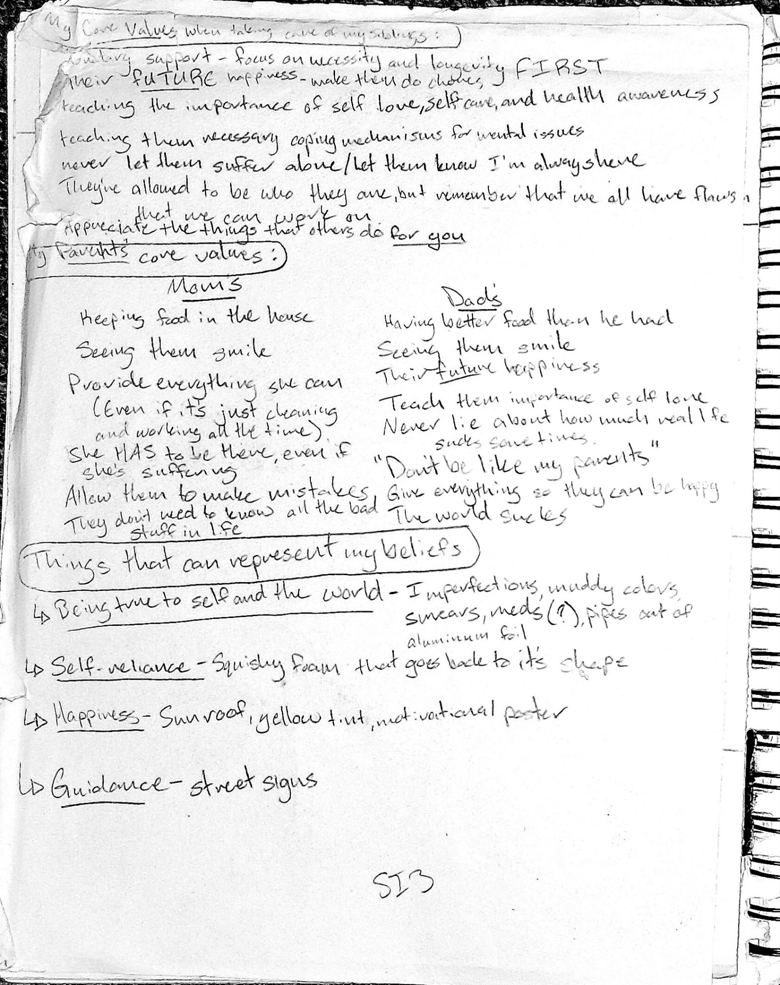 Page 3: My question originally only included my siblings, but I felt that I needed to start exploring my relationship with my parents too, and I also came to the realization that I take on a much more parental role in my sister’s lives than an older sibling. So, I listed my parents core values when raising my siblings versus my own.