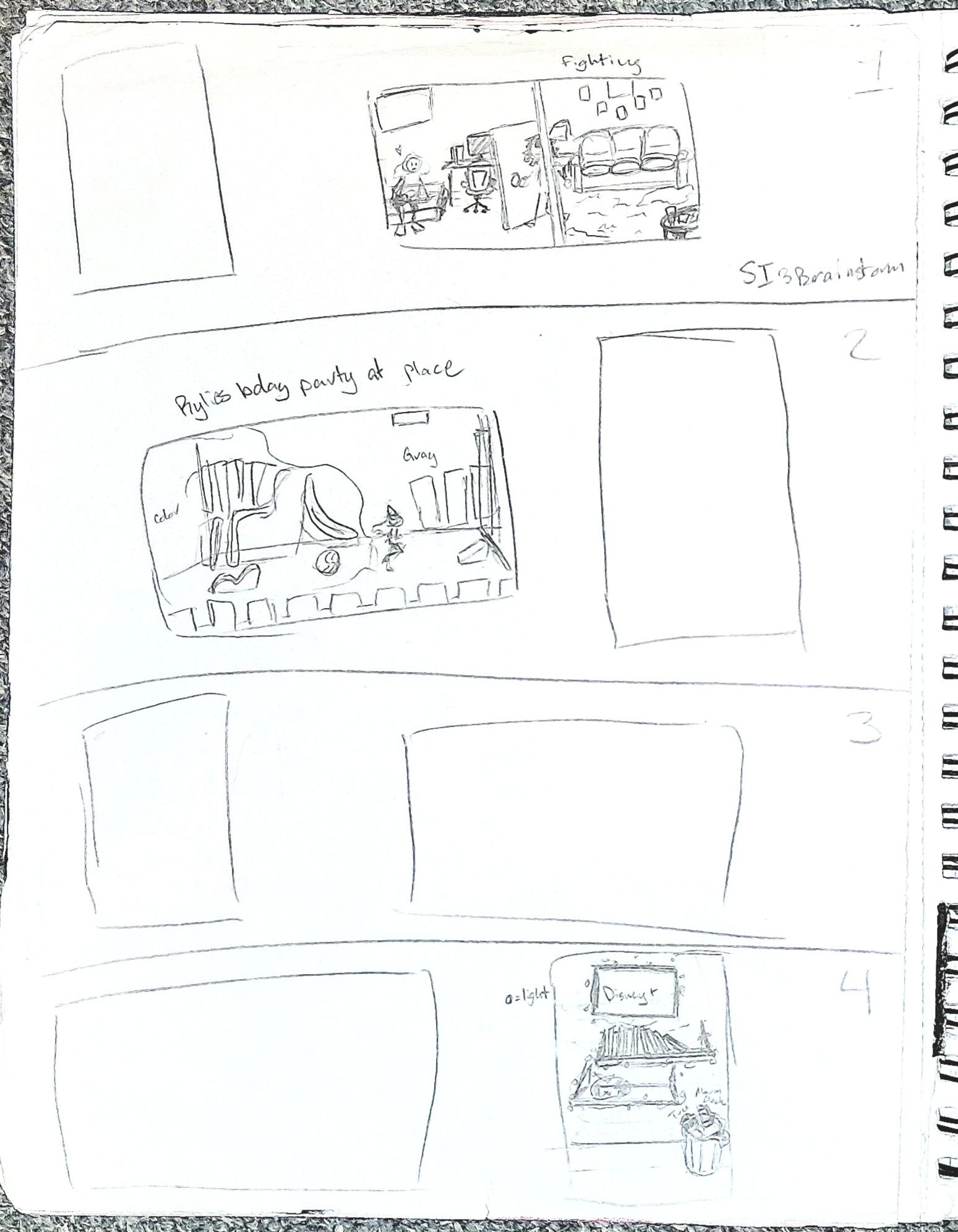Page 4: I finally started to sketch my final product, wanting to stick to the idea of my youngest sister’s birthday party that I sketched on the second page. The idea of representing guidance with street signs and self-expression with graffiti stuck with me and became the main focus of my piece, signs, lamps, and graffiti scattered everywhere throughout the room.